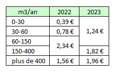 La définition des tranches jusqu’à 400 m3/an En 2023, il n’existe plus que 2 tranches (0-150 m3 et 150-400 m3) au lieu de 3 en 2022 (0-30 m3, 30-60 m3 et 60-400 m3)